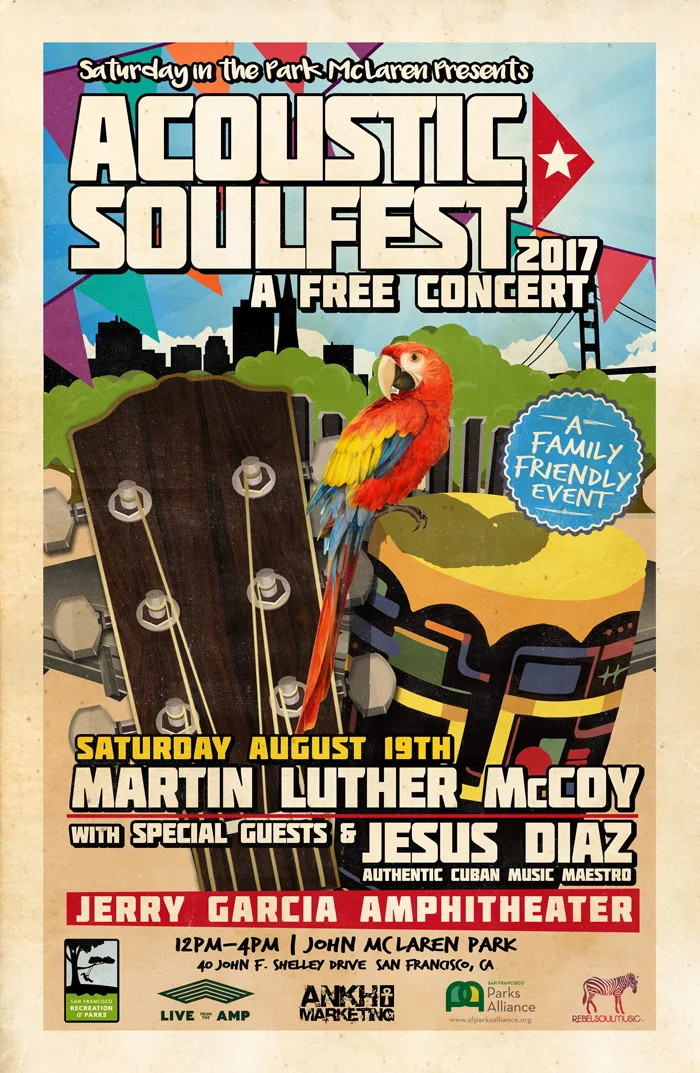 Acoustic Soul Fest - Vol.3 celebrates the brilliant Soul Culture of the Bay Area, featuring San Francisco native and McLaren Park neighborhood resident, Martin Luther McCoy and his great R&B review. This year we're 'going to Cuba' with special guest Jesús Diaz and his band. .